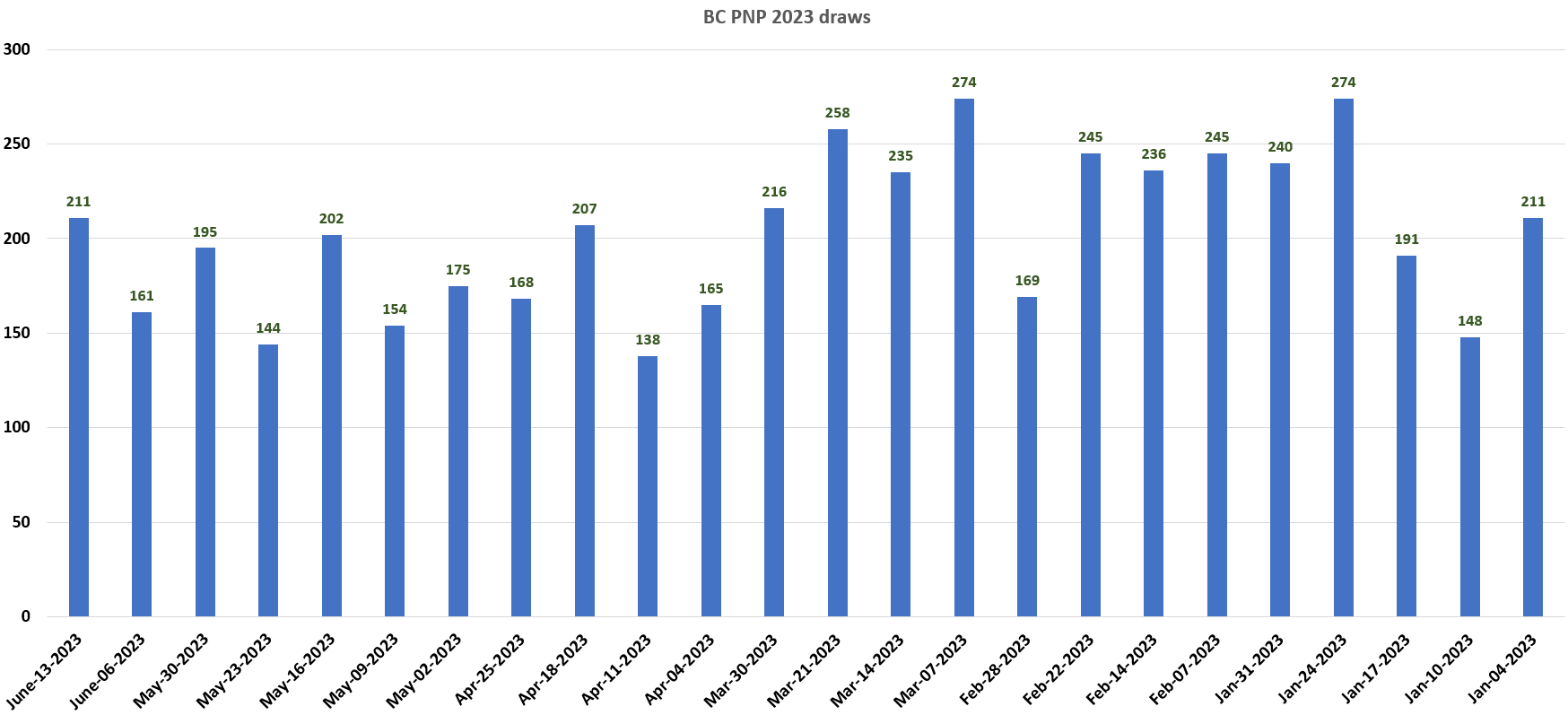 The below graph highlights the draw changes of BC PNP draws held up till June 13, 2023.